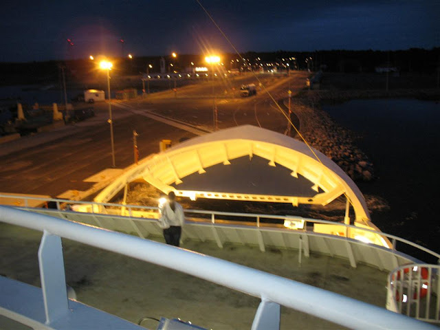 Kad nonākam uz prāmīša, ir jau tumšs. Tomēr mazie turas braši un prieks acīs neizgaist ne uz mirkli! Kā nu ne - pirmais pārbrauciens ar kuģi! Vērojam, kā nolaižas kuģa priekšgals un attālinās vēja ģeneratori. Niklāvs saka, ka brauksim uz Mukusalu. Saku " MUHU, dēliņ, MUHU ! " Viņš paliek pie sava - tā esot Mukusala. Lai tā būtu. :D